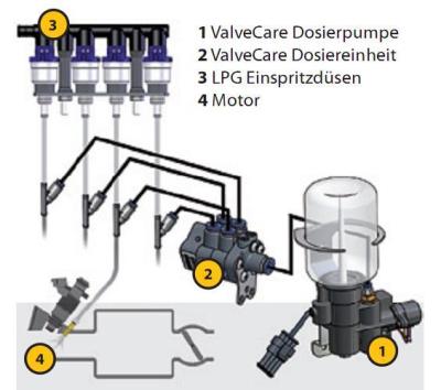 handelsübliche Ottokraftstoff standartmäßig mit Additiven, für die Schmierung der Ventile und Ventilsitze, versehen ist. LPG oder CNG enthalten diese Additive nicht. Mit dem innovativen ValveCare Dosiersystem ist es möglich dem Motor Additive unter Druck zusammen mit dem LPG oder CNG einzuspritzen. Somit wird der Verschleiß der Ventile und Ventilsitze deutlich reduziert.